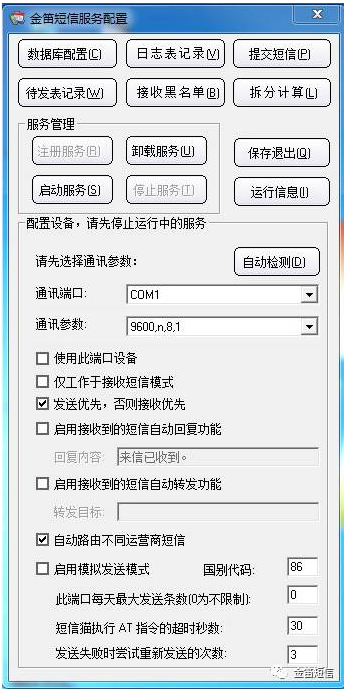 - 提供以WINDOWS 后臺(tái)系統(tǒng)服務(wù)的方式運(yùn)行,機(jī)器重起后自動(dòng)啟動(dòng)短信服務(wù),無需人工干預(yù)啟動(dòng);