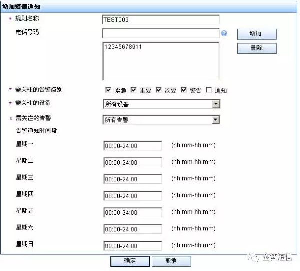 設(shè)置規(guī)則名稱,增加或刪除電話號(hào)碼,選擇需要關(guān)注的告警級(jí)別、設(shè)備及其告警,并設(shè)置告警通知的時(shí)間段,單擊<確定>按鈕完成增加短信通知配置操作。