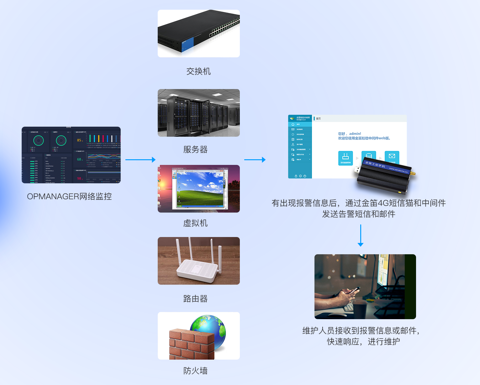 OpManager網(wǎng)絡(luò)監(jiān)控軟件與金笛短信設(shè)備及web版中間件集成通過短信和郵件向您發(fā)送告警通知,IT管理員即時(shí)獲知網(wǎng)絡(luò)故障可以確保網(wǎng)絡(luò)故障得到及時(shí)的處理。