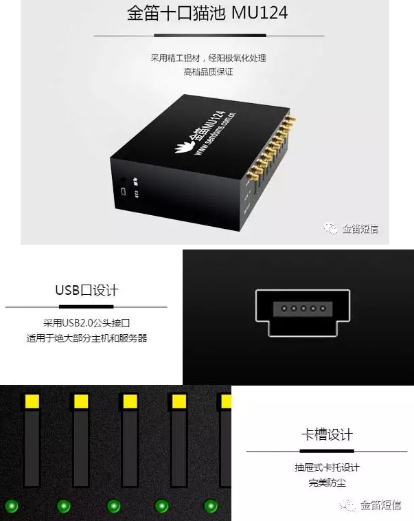 金笛10口貓池MU124是我公司新一代10路GSM/GPRS/CDMA ?USB接口桌面型貓池,軍工品質(zhì),堅(jiān)固穩(wěn)定。機(jī)箱采用加厚的鋼板在高精度數(shù)控機(jī)床上加工成型,能夠承受一定壓力,5~24V電源供電,可用于高低溫、機(jī)房信號(hào)偏弱、偏遠(yuǎn)山區(qū)等惡劣的環(huán)境下使用。可廣泛用于民用、工業(yè)、國(guó)防等領(lǐng)域。