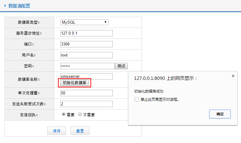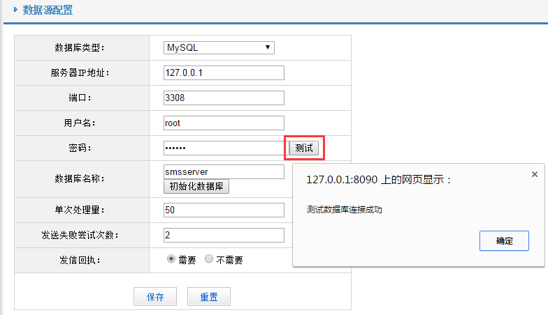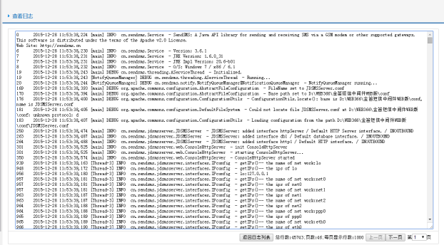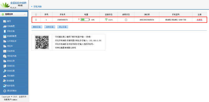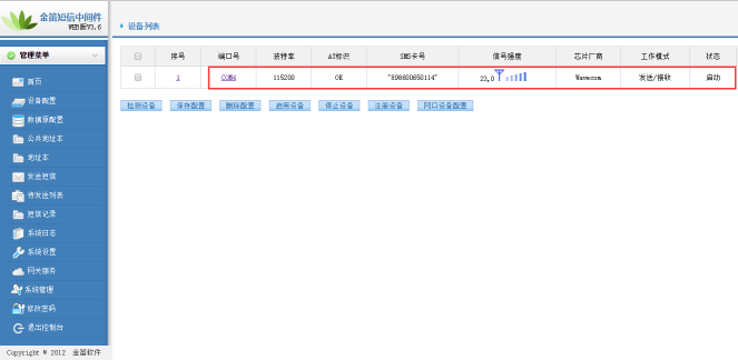 下一步,配置金笛web中間件,首先確保在web中間件中已經連接金笛短信貓設備并且已經啟用設備,如下圖所示: