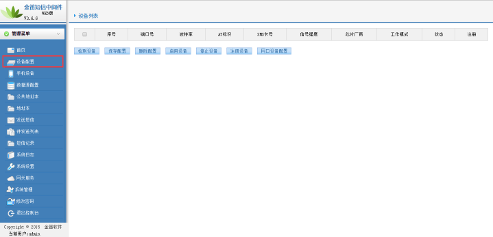 首先,我們要連接配置短信貓設備,點擊左側菜單欄的【設備配置】,可以看到如下界面: