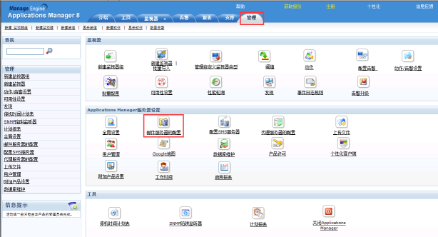金笛短信web中間件通過連接金笛短信設備并且監(jiān)控目標郵箱的方式,來實現(xiàn)與Applications Manager報警系統(tǒng)的集成,首先第一步,需要在Applications Manager中配置郵件服務器,點擊管理界面的“管理”標簽,點擊下圖紅框中“郵件服務器的配置”按鈕,如下圖所示: