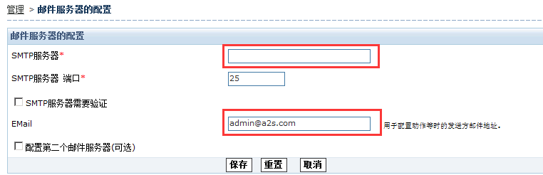 在上圖紅框處,分別填入SMTP服務器地址以及發(fā)件郵箱admin@a2s.com,填寫完成后,保存即可。