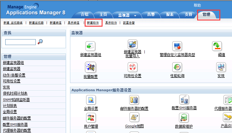 下一步,需要添加報警的動作,點擊“管理”標簽下的“新建動作”,如下圖所示: