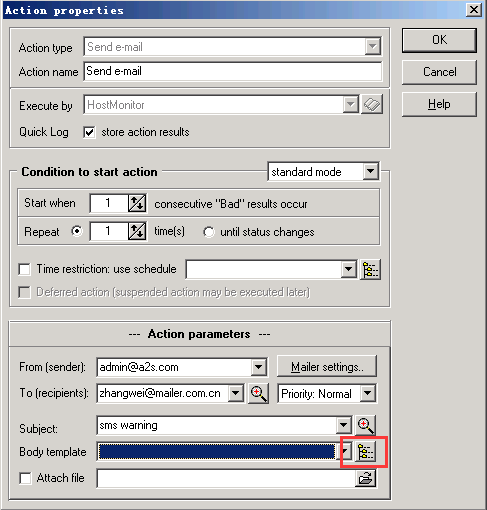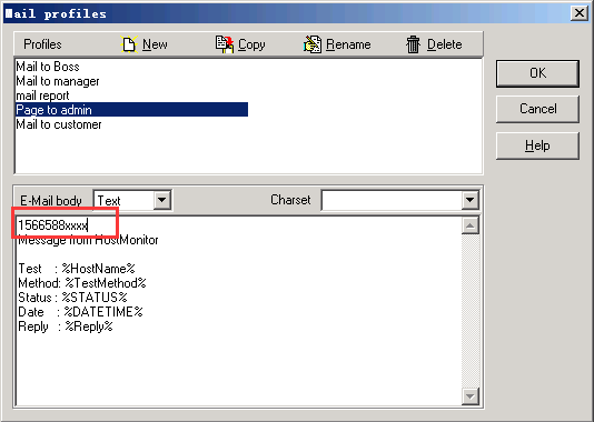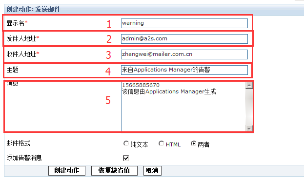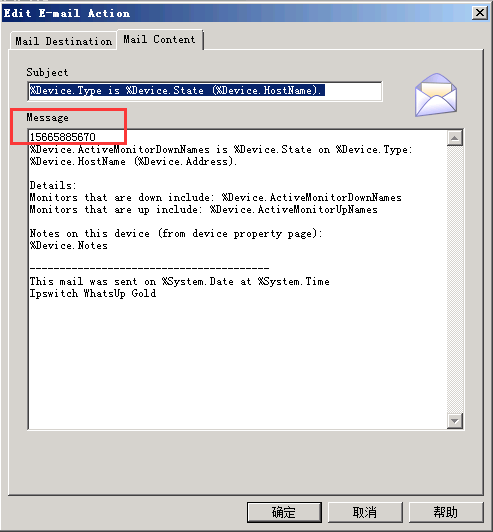 注意郵件模版中內容第一行為接收短信報警的手機號碼。
