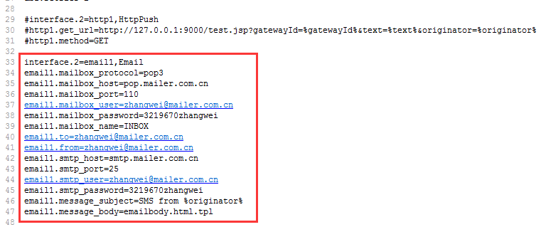 下一步,配置金笛web中間件要監(jiān)控的郵箱,打開中間件安裝目錄下JDSMSServer.conf文件,如下圖: