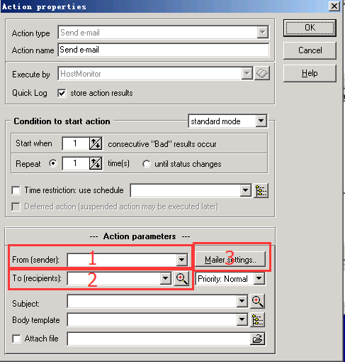 金笛短信web中間件通過連接金笛短信設備并且監(jiān)控目標郵箱的方式,來實現(xiàn)與host monitor報警系統(tǒng)的集成,首先第一步,需要在Host Monitor中設定郵件報警,如下圖所示: