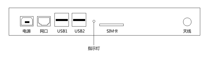 將MN1604一體機的端口朝向自己,按從左到有的順序依次為電源接口、網線接口、USB擴展接口、SIM卡接口及天線接口