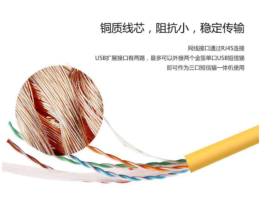 2、網線接口通過RJ45連接;USB擴展接口有兩路,最多可以外接兩個金笛單口USB短信貓,即可作為三口短信貓一體機使用;