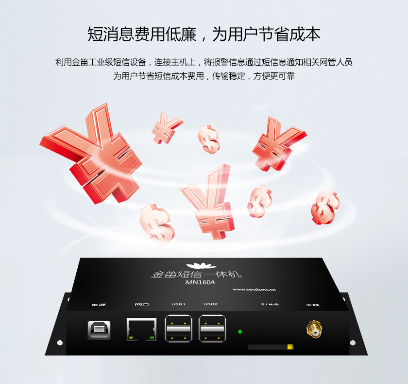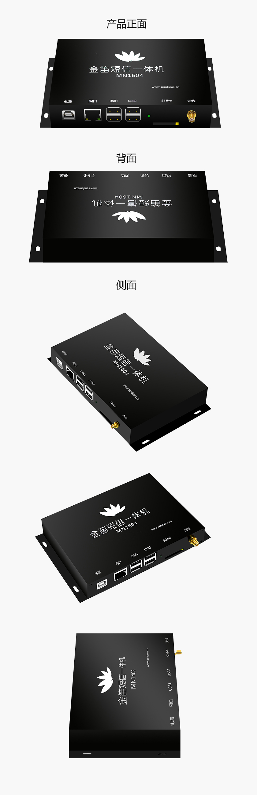 應客戶需求,我公司推出新一代便捷型產品MN1604一體機,MN1604一體機是我們MN1408一體機的mini版,標配單口短信通道及兩個擴展USB短信接口,即最多可以滿足三個端口同時發(fā)送和接收短信,接線方式為RJ45網絡接口,內嵌Linux操作系統(tǒng),內置安裝自主研發(fā)的WEB中間件,可從郵件中提取報警信息,可和網管軟件(比如what’s up等)連接,實現(xiàn)網絡監(jiān)控報警通知。也提供Database數(shù)據庫接口和HTTP接口,可以和其它應用系統(tǒng)鏈接,實現(xiàn)短信通知、短信提醒、短信報警、短信傳輸自定義數(shù)據。也可以用于接收短信。體積小巧,使用方便。