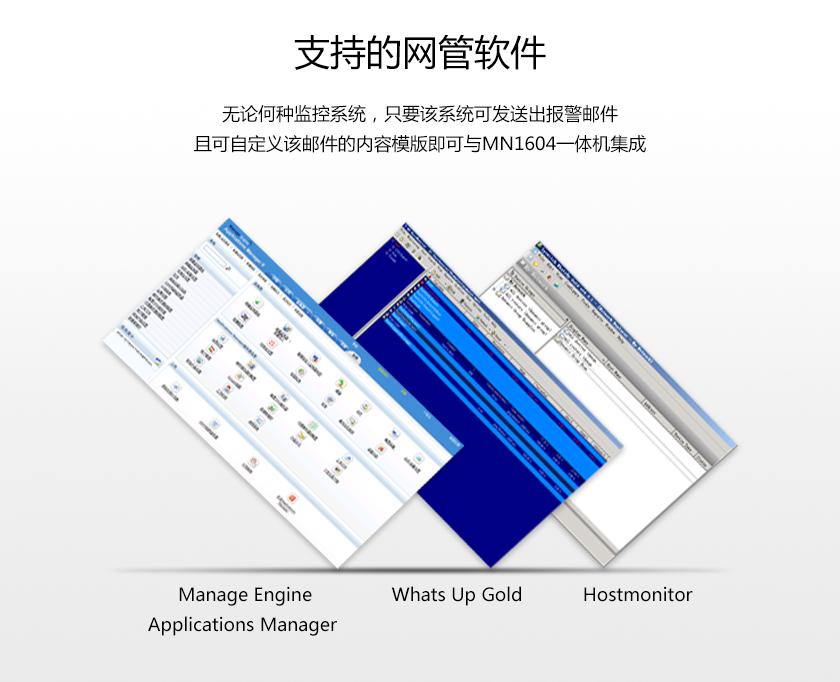 與第三方網管軟件、UPS、防火墻、監(jiān)控系統(tǒng)、網絡設備甚至是業(yè)務應用系統(tǒng)進行無縫對接,自動監(jiān)控報警郵件;
