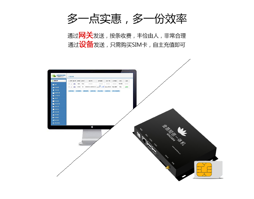 通過網關發(fā)送,按條收費,豐儉由人,非常合理。通過設備發(fā)送,只需購買SIM卡,自主充值即可。