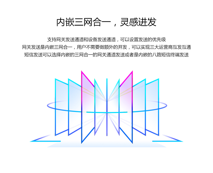 支持網關發(fā)送通道和設備發(fā)送通道。網關是內嵌三網合一,用戶不需要做額外的開發(fā),可以實現(xiàn)三大運營商互發(fā)互通。短信發(fā)送可以選擇內嵌的三網合一的網關通道發(fā)送或者是內嵌的八路短信終端發(fā)送。也可以設置發(fā)送的優(yōu)先級,比如設備優(yōu)先或網關優(yōu)先。