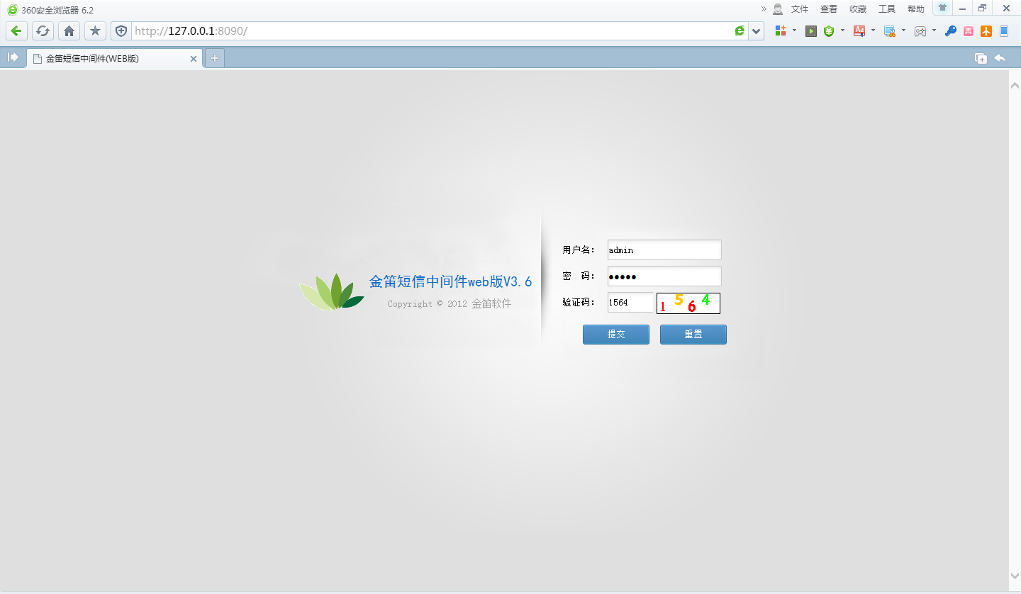 軟件安裝完成之后,打開瀏覽器,在地址欄輸入http://127.0.0.1:8090,回車,或者在開始菜單中打開"金笛短信服務(wù)中間件"目錄下的"金笛短信中間件web控制臺",如下圖: