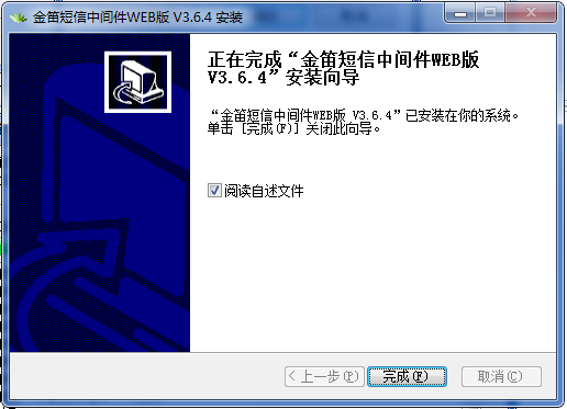 點擊"完成"按鈕后,金笛短信中間件web版安裝完成。