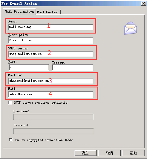 選擇上圖中“E-mail Action”后點擊Next即可,隨后會彈出對話框,配置發(fā)信郵箱以及接收報警提醒的郵箱,如圖所示: