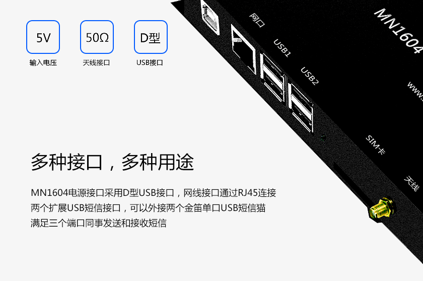 應客戶需求,我公司推出新一代便捷型產品MN1604一體機,MN1604一體機是我們MN1408一體機的mini版,標配單口短信通道及兩個擴展USB短信接口,即最多可以滿足三個端口同時發(fā)送和接收短信,接線方式為RJ45網絡接口,內嵌Linux操作系統(tǒng),內置安裝自主研發(fā)的WEB中間件,可從郵件中提取報警信息,可和網管軟件(比如what’s up等)連接,實現(xiàn)網絡監(jiān)控報警通知。也提供Database數(shù)據庫接口和HTTP接口,可以和其它應用系統(tǒng)鏈接,實現(xiàn)短信通知、短信提醒、短信報警、短信傳輸自定義數(shù)據。也可以用于接收短信。體積小巧,使用方便。
